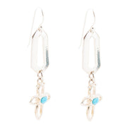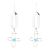 Hand-crafted with care, this stunning pair of earrings features an asymmetrical shape made of high-quality sterling silver. A striking silver cross and a beautiful blue turquoise stone at its center add a touch of elegance. Measuring 2.12" in length and .62" at its widest point, these earrings are lightweight at only 6.58g. Discover the perfect balance of beauty and artisanal craftsmanship with these unique drop earrings.