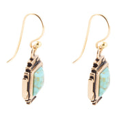 Adorned with ornate Aztec-inspired designs, these stunning turquoise earrings feature bronze accents for a luxurious and eye-catching look. Their 1.25" drop from elegant ear wires makes them perfect for any special occasion.