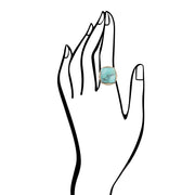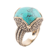 Handcrafted with a golden brass band, this gorgeous ring features a stunning blue turquoise pendant adorned with intricate golden bronze details. Measuring 1.25" tall and with a pendant that measures .88" at its widest point and .75" long, this ring is truly a work of art. It weighs a total of 19.4g, making it a substantial and eye-catching statement piece.
