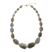 Elevate your style with our Bold Labradorite Statement Necklace! This genuine labradorite beaded necklace features stunning flashes of color and a beautiful grey hue. Handcrafted and finished, it's 19" in length with a 2" extender and weighs 3.9 oz. Upgrade your look with this gold-plated chain and lobster clasp closure necklace.