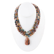 Elevate your look with this stunning Cheyenne Jasper Statement Necklace. Featuring genuine mixed ocean jasper and red creek jasper, this three-layered piece weighs 5.865 oz and measures 17" + 2" with a gold-plated brass extender chain and lobster clasp closure. Crafted and finished by hand, the piece is topped with a unique pendant that measures 1.5" in length and 1" in width. Show off your style and get ready to wow!
