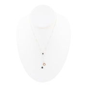 Indulge in the luxurious beauty of this hand-crafted Circle Two-Toned Grey Labradorite Sterling Silver Necklace. Each genuine labradorite stone is carefully placed in a sterling silver bezel, with a golden bronze circle delicately hanging from the center stone. The necklace boasts a perfect balance of silver and bronze tones, measuring 16" in length with a 2" extender. The largest stone is .2" wide, and the entire necklace weighs just 4 grams. Own a unique piece of artisan jewelry that exudes elegance and charm.
