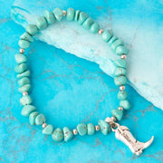 This Cowgirl Up charm bracelet is expertly handcrafted using genuine blue turquoise magnesite stones and a sterling silver boot charm. Measuring at 7.25" in length, the charm itself is 1" long from its hanging point and has a width of .5" at its widest point. With a total weight of 14.69g, this bracelet is truly a unique and precious piece.