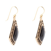 Experience the stunning beauty and incredible craftsmanship of these exquisite Dimond Black Onyx Stone Golden Drop Earrings. Handcrafted and polished to perfection, each earring features a dazzling dimon-shaped blue lapis stone delicately surrounded by golden bronze. With its elegant 1.65" length and .75" at its widest point, these earrings will add a touch of grace and sophistication to any outfit. Weighing a total of 10.6g, these earrings are the perfect combination of style and comfort. Don't miss out on this unique and alluring accessory that will surely make you stand out from the crowd.
