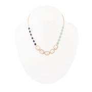Elevate your style with our Dual Color Blue Lapis Turquoise and Mother of Pearl Golden Necklace! Made with genuine bronze, lapis, turquoise and mother of pearl, this adjustable 18.5" - 20.5" necklace weighs 17.25 grams and features a stunning 2" extender chain. Make a statement with the largest setting measuring 0.6" at its widest point.