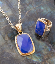 This stunning statement ring showcases a meticulously crafted, hand-finished rectangle faceted blue agate stone that measures 1" in length and features a beautiful 0.63" width at its widest point. The band, made of luxurious golden bronze, boasts intricate detailing for added elegance. With a total weight of 12.5 grams, this ring is truly a work of art.