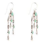Expertly crafted, these Floral Chandelier Turquoise and Sterling Silver Earrings feature genuine turquoise stones set in delicate sterling silver bezels. The intricate floral design creates a chandelier shape that hangs 2.1" from the ear wire, making a bold statement at 1" in width. Hand-crafted and finished, each earring weighs 4.5 grams for a lightweight and comfortable wear. Embrace the stunning combination of turquoise and silver with these exquisite earrings.
