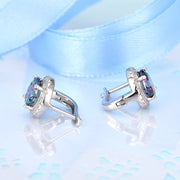At the center of each earring is a genuine mystical rainbow topaz stone, carefully selected for its unique and stunning iridescent colors. The topaz is surrounded by a halo of smaller crystals that add to the overall beauty and sophistication of the earrings.