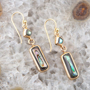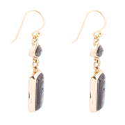 Indulge in the luxurious beauty of these handcrafted golden bonze earrings, adorned with a stunning diamond-shaped blue abalone stone and a rectangular blue abalone stone below. Measuring 1.75" in length and .25" at its widest point, these earrings have a total weight of 5.7g. Elevate your look with these exquisite pieces!