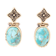 Indulge in the exquisite beauty of these handcrafted Golden Flower and Blue Turquoise Earrings, adorned with a golden bronze flower detail and a stunning oval blue turquoise stone. Measuring 1.12" long and 0.62" at its widest point, these earrings are expertly crafted with a total weight of 5.9g, making them a truly unique and elegant addition to your jewelry collection.