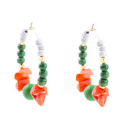 These stunning earrings showcase vibrant green and coral stones layered over gold plated bronze. The beads and stones display shades of white, red/orange, and green, bringing a pop of color to any outfit. Weighing 14 grams with a length and width of 1.5 inches, these earrings are a perfect blend of elegance and statement. Add these to your collection and elevate your style game!