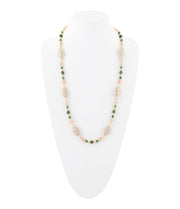 Experience the exquisite handcrafted beauty of our Golden Necklace, featuring a unique blend of natural green jade and pink sunstone. Measuring 29.5" in length plus a 2" golden chain extender and with a maximum width of .70", this necklace is sure to make a statement. With a total weight of 60.7g, it is a stunning and substantial piece that will add a touch of elegance to any outfit.