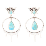 Individually crafted with care and attention to detail, these earrings feature a stunning sterling silver bee and a blue turquoise stone. The unique design includes a sterling silver circle that mimics dripping honey, with a teardrop-shaped blue turquoise stone hanging from the center. Measuring 1.75" in length and with a widest point of .89", these earrings weigh a total of 8.6g and are sure to captivate anyone who sees them!