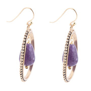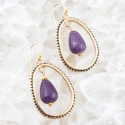 Experience the luxurious elegance of our Inline Purple Jade Drop Golden Earrings, featuring a stunning golden brass oval and a mesmerizing purple jade stone. These uniquely crafted and finished by hand earrings measure 1.75" in length and its widest point is 1", with a total weight of 11.5g. Elevate your style and embrace the exquisite craftsmanship of these earrings.