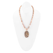 Handcrafted and finished with care, the genuine jasper slab pendant hangs elegantly from beaded peach coated hematite beds. With an adjustable length of 19" + 2" extender and a secure lobster clasp closure, this necklace is both stylish and functional. The oval shaped pendant, at 2" in length and 1.25" at its widest point, adds a touch of sophistication. Weighing only 7 oz, this piece is lightweight and comfortable to wear. In soft shades of pink and green, this necklace is perfect for adding a pop of color to any outfit.