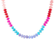 Handcrafted from golden brass, this stunning necklace features a variety of genuine stones such as quartz, jade, and magnesite. Each stone boasts a different vibrant color including blue, purple, pink, red, orange, and yellow. Measuring 17.5" long with an additional 2" chain extender, this necklace has a total weight of 39g and a width of .30" at its widest point. Every piece is expertly finished by hand, making it a truly unique and exquisite accessory.