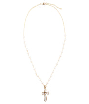 Handcrafted and meticulously crafted, this necklace is made with a golden bronze chain and adorned with beautiful white mother of pearls and cross pendant. It measures 28" with an additional 2" extender and the pendant is 2.5" long, its widest point is 1.12". With a total weight of 48.1g, this piece is sure to make a beautiful statement.