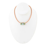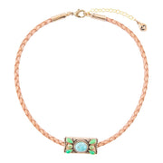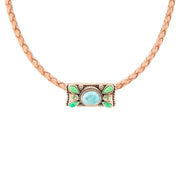 Indulge in luxury with this hand-crafted leather necklace measuring 15" long with a 2" extender and a lobster clasp. The focal point is a stunning combination of golden bronze, genuine blue and green turquoise, and green perider stones, measuring .62" long and 1.25" wide at its widest point, with a total weight of 16.7g. Made with passion and finished to perfection.