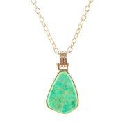 This handcrafted necklace features a vibrant lime turquoise stone encased in a bronze bezel, suspended from a golden brass chain. With an adjustable length of up to 27 inches this necklace offers versatility. The pendant hangs 2.5 inches in length and measures 1 inch at its widest point, creating a striking statement. Weighing just 1.6 oz, this necklace is the perfect balance of durability and grace.