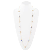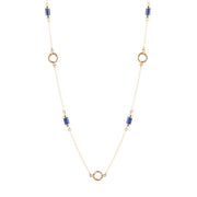 Indulge in the luxurious allure of our Long Delicate Lapis and Bronze Necklace. Made of genuine lapis and golden bronze, this 40" necklace features blue stones in cylinder shapes and hammered bronze circles. Hand-crafted and weighing 20 grams, it exudes elegance and style. With a lobster clasp closure and 2" extender, it guarantees a perfect fit.