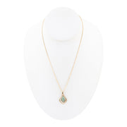 Experience the natural beauty of green aventurine with this stunning pendant necklace. The teardrop stone is carefully placed in a golden bronze bezel and hangs from a delicate chain, measuring 18" with a 2" extender. The pendant itself is 1.2" in length and .7" in width, making it the perfect statement piece. Handcrafted with care and weighing only 6.5 grams, this necklace showcases a beautiful blend of green and gold. Let this necklace inspire you with its unique and handmade charm.