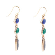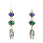 Experience the stunning combination of genuine lapis, abalone, green onyx and bronze in our Odyssey Lapis Multi-Stone Earrings. Adorn your ears with these hand-crafted beauties, featuring a green onyx stone, lapis stone and abalone stone, all elegantly linked in bronze bezels. Feel the luxurious weight of .13 oz and a length of 2.25", with a touch of .25" at its widest. A perfect blend of blue, green, and golden bronze for the ultimate statement piece.