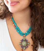 Prescott Blue Turquoise Purple and Orange Statement Pendant Golden Necklace