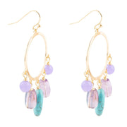 These dazzling earrings boast a gold-toned brass hoop design with a variety of eye-catching charms. On each earring, you'll find a small round purple turquoise bead, an elongated oval-shaped Amethyst bead, and a larger, oval turquoise magnesite stone with natural veins visible. The combination of these colors creates a stunning and bohemian look, perfect for those who value unique and vibrant jewelry. Weighing 10 grams and measuring 1 inch wide at their widest point, these handcrafted earrings hang 2" from a gold plated brass fish hook ear wire, ensuring both style and comfort.