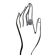 Individually handcrafted and carefully polished, this statement ring showcases stunning blue lapis tear drop stones and surrounded by circling purple turquoise stones and detailed with gleaming golden bronze. Measuring at 1.25" in height and 1.10" in width at its widest point, this piece weighs a total of 21g, making it a unique and eye-catching addition to any collection.