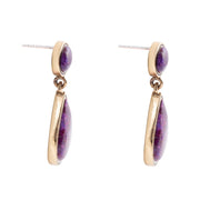 These exquisite earrings feature vivid purple turquoise stones placed in a lustrous bronze setting. Each earring consists of a round stone with a delicate teardrop stone suspended beneath it. Weighing a mere 12 grams, these beauties dangle 1.5 inches from a sterling silver post and measure .5 inches wide at their widest point. Handcrafted to perfection for a truly unique and stunning look.