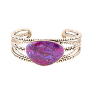 Stunning purple turquoise set in a bronze bezel adds a pop of color to this hand-crafted and finished cuff bracelet. The roped texture of the bronze adds a touch of elegance. Lightweight at just 1.2 oz, this bracelet is 2.3" in diameter with a 1.25" width and .9" length stone.