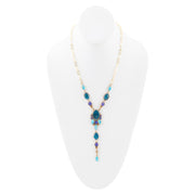 Elevate your look with our Regal Blue Apatite Mixed Stone Golden Pendant Necklace. Genuine bronze and a mix of apatite, turquoise, and blue agate create a luxurious and unique design. Hanging pendant measures 4", these necklaces are 17.5" long plus a 2" chain extender and lobster claps and .87"at the widest point and weighing a total of 26.9g each. Add a touch of elegance to any outfit with these beautiful pendant necklaces.
