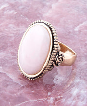 Experience the beauty and elegance of our Rosie Pink Opal Ring. Handcrafted with a genuine pink opal resting in a golden bronze bezel, this ring features a stunning floral design engraved into the bronze. The oval-shaped stone measures 1" by .75", making it the perfect statement piece. Weighing 17.5 grams, this ring is both lightweight and durable. Let the vibrant pink and gold colors add a touch of luxury to any outfit.