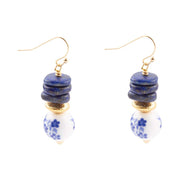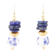 Expertly crafted by hand, these cobalt blue lapis drop earrings feature genuine lapis and porcelain beads suspended from gold-plated brass. With a length of 1.75 inches and a width of 0.5 inches, each earring weighs 5.5 grams and showcases the stunning combination of blue and white. The perfect choice for a sophisticated and elegant look.