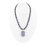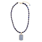 Indulge in the beauty of this handcrafted Santorini Cobalt Blue Lapis Golden Necklace, weighing an elegant 42.5 grams. The genuine Lapis pendant measures 2" in length with a width of 1", while the necklace can be adjusted between 17.5" - 19.5" with the 2" extender chain. Experience the rich colors and exquisite craftsmanship firsthand.