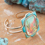 Experience the captivating beauty of Scenic Sedona with this golden cuff bracelet, handcrafted with genuine turquoise and bronze. The clear glass overlay showcases an exclusive design featuring a stunning desert scene. Measuring 1.8" in length and 1.5" in width, this statement piece weighs 1.1 oz, making it a comfortable and eye-catching accessory. Inspire envy and admiration with the breathtaking blue and gold colors of this meticulously crafted and finished bracelet.