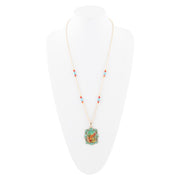 Experience the breathtaking beauty of the Scenic Sedona Desert with our Desert Blue Turquoise Golden Pendant Necklace. This stunning piece features a genuine turquoise stone pendant surrounded by a vibrant desert picture under a clear quartz overlay. The adjustable necklace can be worn up to 30" with a secure lobster clasp closure. Admire the 2.25" length from the bale and 1.5" width at its widest point. The necklace weighs 1.12 oz and is expertly crafted and finished by hand. Treat yourself to this truly remarkable and one-of-a-kind piece.