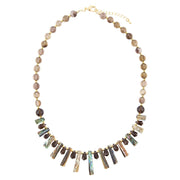 Hand-crafted with a unique touch, this statement necklace features a charming combination of brown and gray smoky quartz beads paired with multi-colored abalone rectangle stones and accented with elegant golden brass details. Measuring 18" in length with a 2" chain extender and finished with a lobster clasp, this stunning necklace has a total weight of 36.9g.