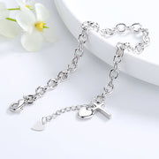 The bracelet's design features a detailed heart and cross charm that is carefully crafted from sterling silver, with a polished finish that adds to its beauty and shine. The heart and cross symbolize love and faith, making this bracelet a great gift option for someone who values these virtues.