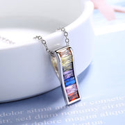The pendant of the necklace features a baguette-shaped crystal that is studded with multi-colored Swarovski crystals. The crystals are carefully placed to create a rainbow of colors, adding a playful and joyful touch to the necklace.