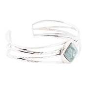 Indulge in the natural beauty of Terra's Green Seraphinite and Sterling Silver Cuff Bracelet. Genuine seraphinite is placed in a diamond-shaped sterling silver bezel, complemented by hammered metal. The bluish-green color and handcrafted design make this a stunning addition to any outfit. Stretching and squeezing to fit most wrists, this bracelet weighs 25.2 grams and stone measures .6" in length.