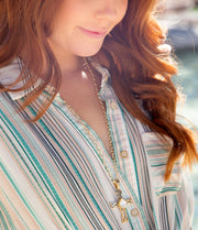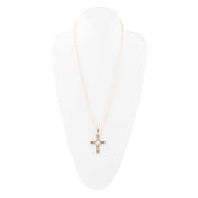 Adorned with a stunning mother of pearl stone at its center, this intricate golden cross pendant is suspended from a luxurious golden bronze chain. The necklace can be adjusted up to 30" with a convenient lobster clasp closure, while the pendant itself hangs 2.25" from the bale and measures 1.5" at its widest point. Weighing 35 grams, this necklace is crafted and finished by hand, showcasing the beautiful combination of gold and white colors. Experience the exquisite quality of mother of pearl and bronze materials in this must-have accessory.