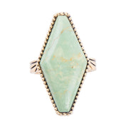 Featuring genuine green turquoise and bronze, the Trillion Green Turquoise Ring is a mesmerizing, elongated hexagon design. Show off the unique top of rings with its 1.25" length, 0.65" at it's widest point and a bottom band width of 3mm. Weight of the ring is 5.8 grams. Let this stunning piece of jewelry captivate you with its vibrant color and beauty!