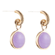 Handcrafted and expertly finished with care, these earrings feature a vibrant purple quartz stone in a circular shape, dangling below a half-circle of stunning golden bronze. Measuring 1 inch in length, with a width of 0.5 inches at the widest point, these earrings have a total weight of 5.06 grams.