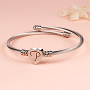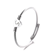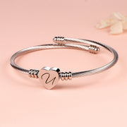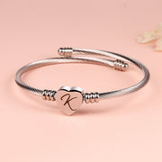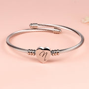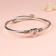 The bracelet's design features a twisted steel cable that is both durable and flexible, making it comfortable to wear. The heart charm adds a touch of romance to the bracelet, while the personalized initial charm allows you to add a personal touch and make it your own.