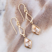 Elevate your style with these White Calcite Matrix and Bronze Drop Earrings. Made of genuine white calcite matrix stone and bronze, each earring features an abstract design and hangs at 1.75" from the ear wire. The stone measures .5" in length and .4" in width, adding a touch of elegance. Each Earring weighs .07 oz so it is lightweight and comfortable. These earrings are crafted and finished by hand, making them truly one-of-a-kind. Get ready to dazzle in white and gold.
