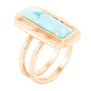 Handcrafted with care and attention, this ring feature a stunning blue turquoise rectangle nestled within an open design bronze bezel. The ring weigh a total of 5.70 grams and boasts a .5-inch width at its widest point, and .90 inches long. Delight in the gorgeous combination of blue turquoise and golden bronze, making this ring is a must-have addition to your jewelry collection.
