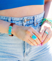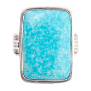 Indulge in the luxurious beauty of sterling silver and Zion Blue Turquoise with this handcrafted statement ring. The .9" rectangular stone is securely set in a sterling silver bezel, making it a stunning addition to any outfit. At .6" in width and weighing only 7.6 grams, it is the perfect balance of elegance and comfort. The vibrant blue hues of the turquoise and silver accents make this ring a must-have for any jewelry collection. Each piece is meticulously crafted by hand, ensuring its unique and exquisite quality.