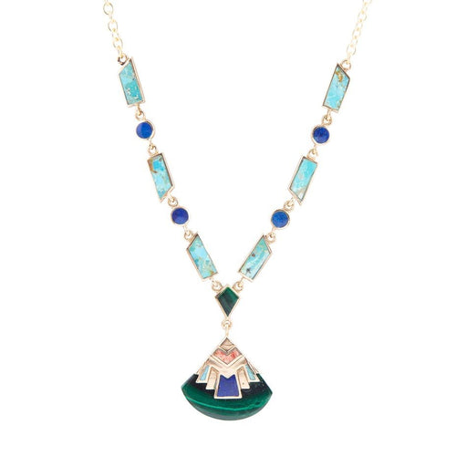 View full detailsEmbrace the vibrant beauty of the Art Deco Colorful Inlay Golden Necklace. Featuring genuine turquoise, malachite, lapis, and orange sponge coral i...