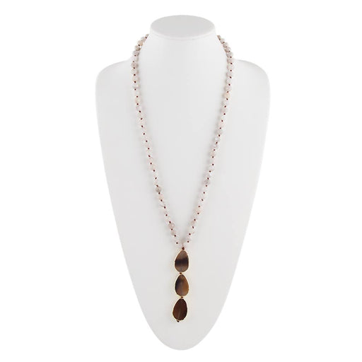 Three glass smooth agate stones edged in gold plate lay in linear order on an endless 36" knotted brown cord of white and grey agate. •Genuine agat...